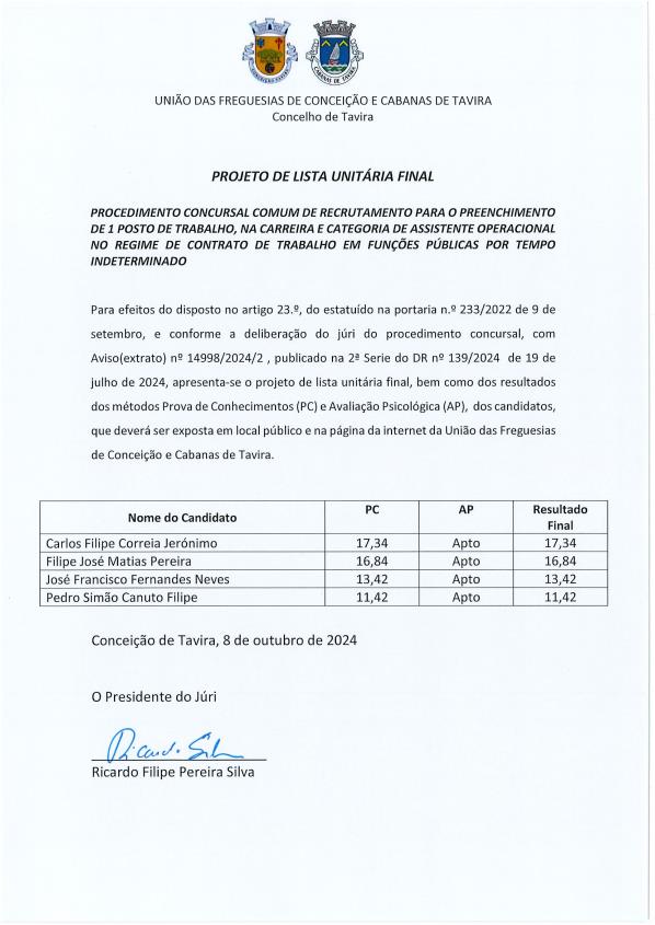 Procedimento concursal - Assist. Técnico - março de 2024 Formulário de Candidatura ao Procedimento Concursal (PDF)Aviso (PDF)Aviso DR (PDF)Projeto de Lista Unitária Final (PDF)Lista Unitária (PDF)